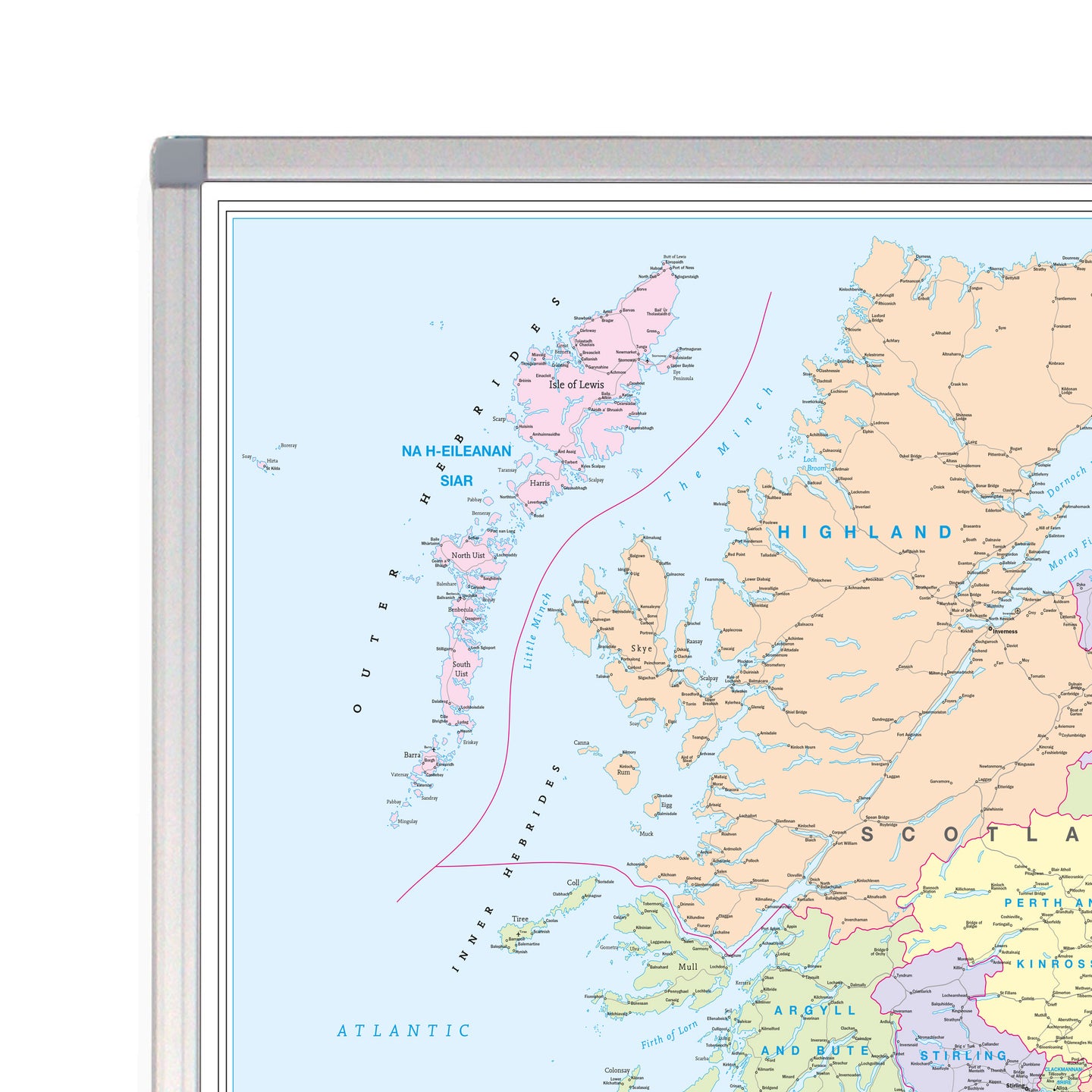 A wall map of the UK and Ireland showing all of the County, District and Unitary Authority boundaries.