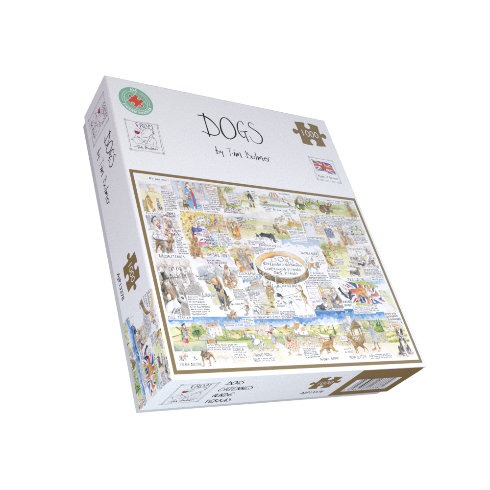 Dog lovers rejoice for Tim Bulmer’s “Dogs”! This charming jigsaw puzzle is filled with fun facts about our favourite canine companions – did you know in the 1800’s Yorkshire Terriers would be carried in the pockets of miners down to the mines to go ratting? Or that St Bernard’s have been used by Bernadine Monks since the 1660’s to lug heavy loads? All of this is accompanied by Tim’s delightfully cheeky illustration style, this puzzle will challenge you and your family and provide hours of fun!